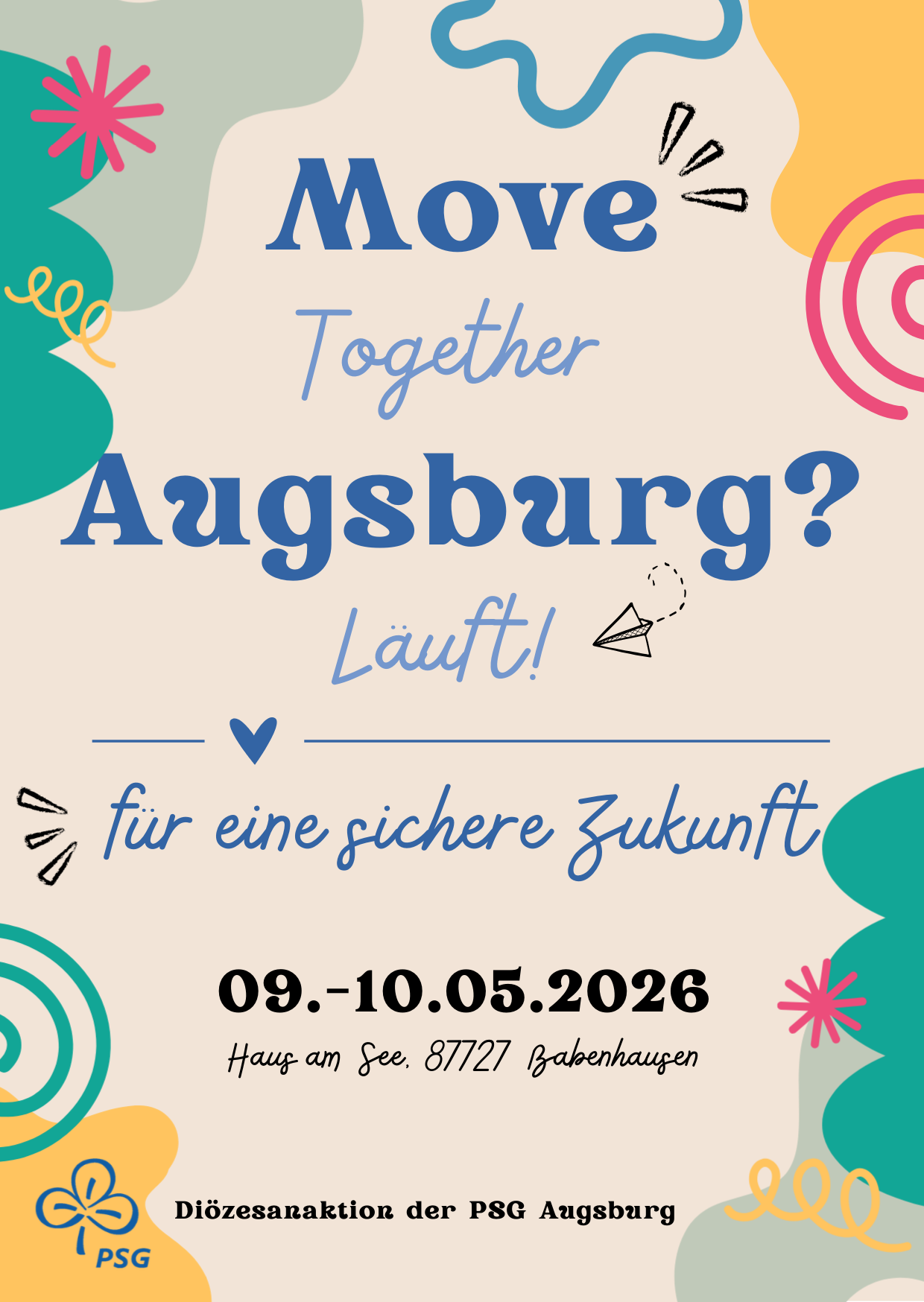 Der Höhepunkt der Aktion "Move togehter", die über Insta läuft, soll unser diesjähriges Diözesanwochenende sein. Dort laufen wir alle zusammen als Diözese Augsburg für das Thema „sichere Zukunft“ zum Zeltplatz nach Babenhausen. Es findet am 9.5.- 10.5.26 statt – bis dahin könnt ihr euch mit eurer Gruppe/eurem Stamm für ein Unterthema von „sicherer Zukunft“ entscheiden, für das ihr an diesem Wochenende laufen wollt. Einen Vorschlag, wie ihr das machen könnt, findet ihr weiter unten bei den Gurppenstundenideen